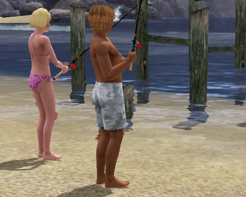After having a drink from the juice bar, they head to the shore and begin fishing while exchanging a lively conversation about nothing in particular. The time passes quickly, and Mark begins thinking about taking up their favorite spot under the palm trees. The happy thought is quickly erased as Charlotte lets out a sharp squeal of suprise as he is pushed face down into the surf.