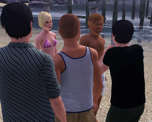 1. When I do some of these scripted scenes, I take a copy of my main game and move the sims I want to use into the household. These three knuckleheads were actually custom made for the story. The two dark-haired boys are brothers who live on the “bad” side of town. Their last name is Long, but I can’t remember their first name offhand. Ali is also a custom sim, and he’s got a “special” place in the legacy.