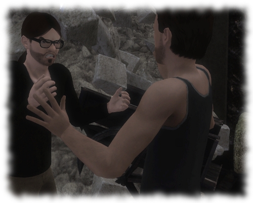Mark leaps up, his face red with embarrassment. Still facing Charlotte, he begins to protest at her, but sees the telltale look of fear on her face; her eyes fixed on a point behind him. Mark turns and grimaces. He narrows his eyes and sizes up his odds.