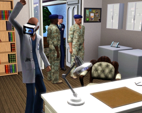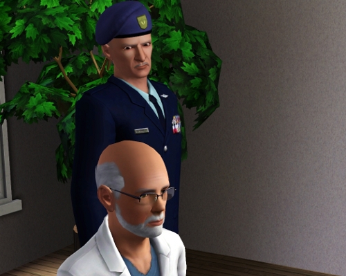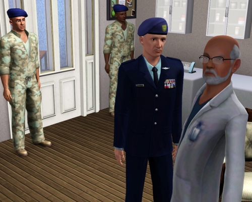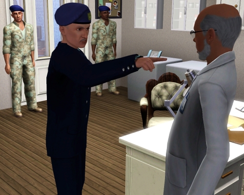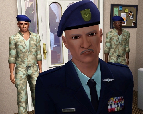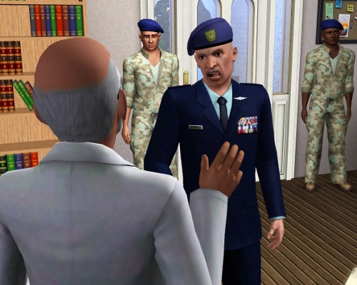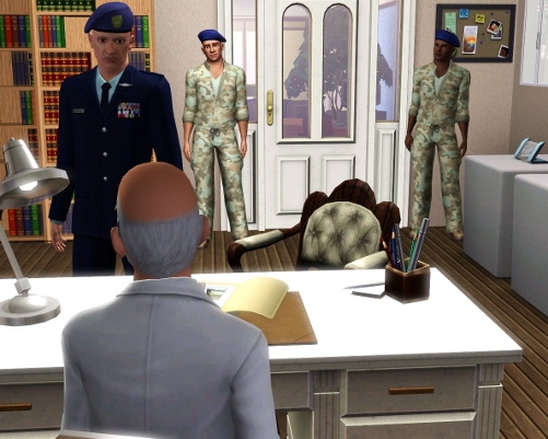 | David can hear a commotion over her protests on the intercom, and on the other side of the door just before it is opened with an unneccessary show of force. David sets his game down and eyes the intruders. An older gentleman wearing a military uniform is flanked by two brutes in fatigues. One of the brutes closes the door as the older man enters. |