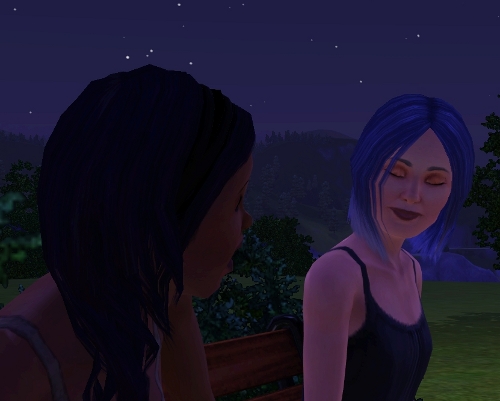 | Faith catches movement in her peripheral vision, and she turns slightly to see shining silvery hair in the moonlight. Kacey is sitting at the bench on the opposite side of the pond. She kisses Jimmy and tells him to go back inside while she talks to the mysterious guest. Jimmy nods his understanding. This is the first time Faith has seen her outside of the guest suite since the night of the rescue. Faith has not told anybody about her vision that night in the cavern, but something tells her that now is the right time. She gently approaches the bench where Kacey is sitting, with large tears on her cheeks reflecting the moonlight. Faith sits down and gently calls her name. She wipes off the visible tears and tries to conceal the deep frown on her otherwise pretty face. Faith smiles and tentatively says that she disappointed that she missed the party. Kacey nods and apologizes. |