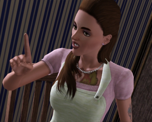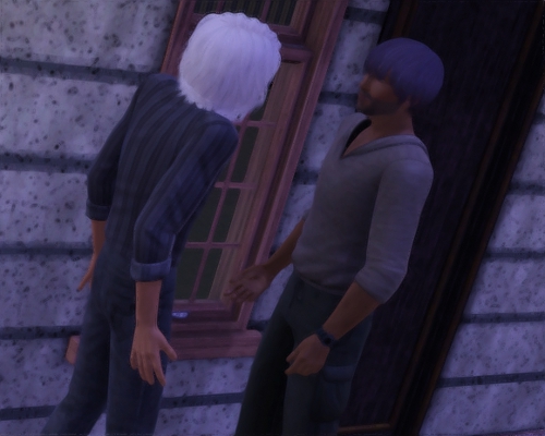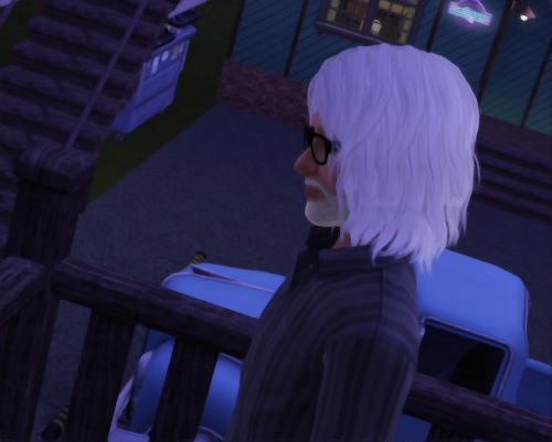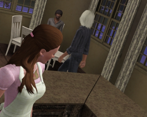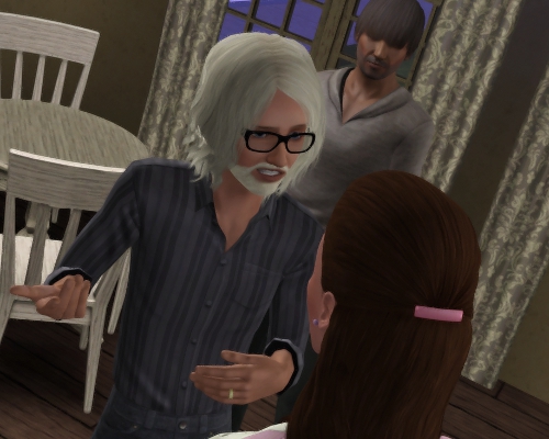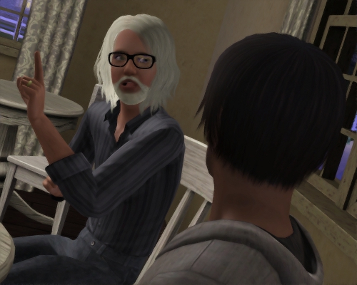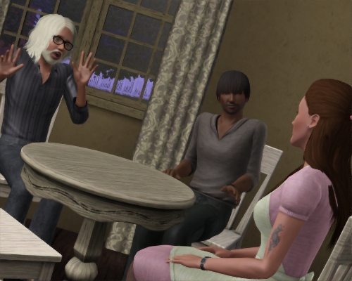 His eyebrow jerks upward and he gives her an apologetic smile, showing off his wedding ring. She frowns and asks about Gerard, who is clueless about what they are saying in simlish. Doc’s eyebrow jerks up again and he chuckles, informing her of his priestly vocation. The waitress walks off, exasperated, but thankful for the generous tip Doc leaves for her.