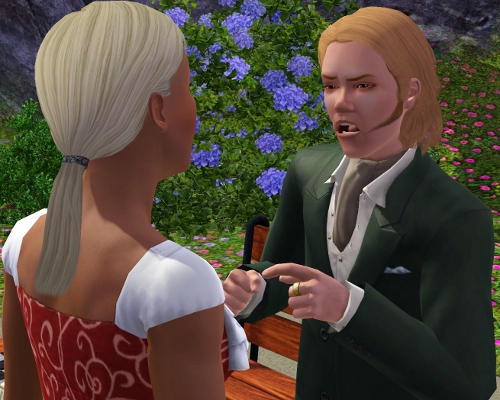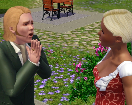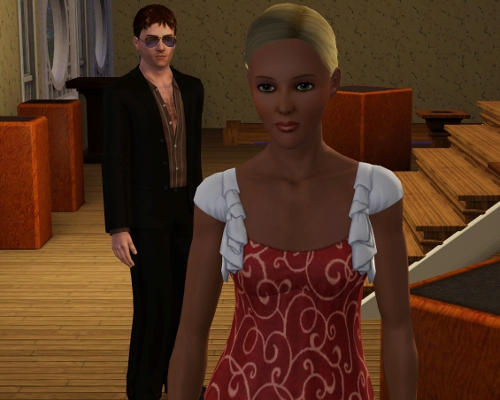 Amber’s mood changes instantly when she finds his eyes focusing on a spot about a hands-width below her chin. Amber frowns and wonders out loud if this was a bad idea, and begins to leave. Brand stands and apologizes, complimenting her striking beauty and decrying his own lack of manners. With is eyes now focusing more appropriately, Amber is somewhat taken aback by the sincerity of his apology. She had not expected it. She knows when a sim is lying, and his apology was no fluff. Slightly confused by this, Amber cocks her head and listens to what he has to say.