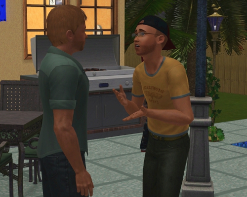 Luke spots Alex, who has had a birthday since the last time they saw each other. Luke laughs and greets Alex with a strong hand-shake and a slap on the shoulder. Alex had signed a big contract with the Llamas to fill in a hole at the end of their batting line-up. He is a guaranteed RBI in most cases, and plays a pretty good second base. They talk baseball for awhile before Luke asks what the deal is with Sandi, wondering out-loud why she hasn’t come over to chat.