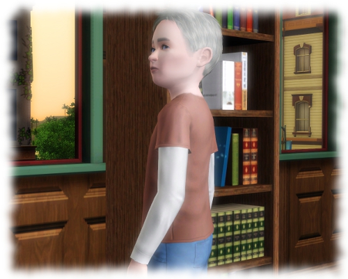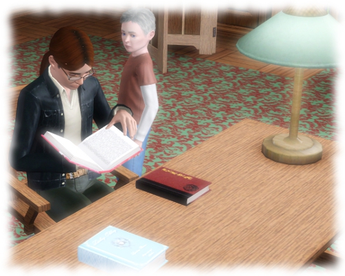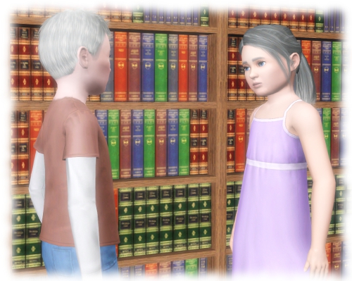 | Reid instantly buries his face in the new books, ignoring both his sister and Adam. She takes a couple graceful steps closer to Adam, then blushes in kind. When she is close, she just studies him for a short time. A sweet smile appears on her face, as if to thank him for visiting. But before either of them can speak, the memory fades, and Adam emerges again into his bedroom. Kay is standing beside him, commenting on the plaque above his bed. |