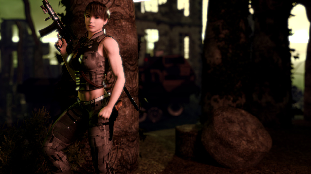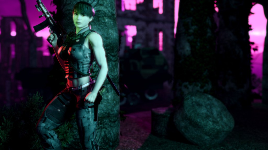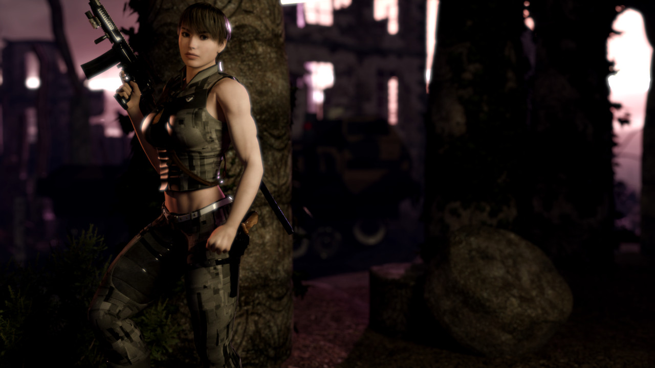 I decided to play around with the light colors in this scene just to experiment and gauge what sort of impact they would have on the final render. So I tossed SciFi Girl into the middle of a rad-storm in the Fallout 4 world. I was surprised by the striking outcome.