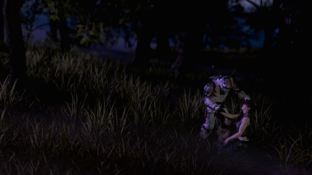 A rueful smile crosses her lips when the weapon goes silent after the last cartridge is spent. Her companion’s weapon has also slowed its near-perfect rate of kills. His distressed gasps for air replace the din of fighting. A stillness settles over the forest floor as insects mill about somehow communicating their next moves. The big predator had retreated slightly into the forest after being wounded. It is still there. She can see it observing them from a distance. She can also sense another thing nearby – the same follower she had noticed earlier while driving.