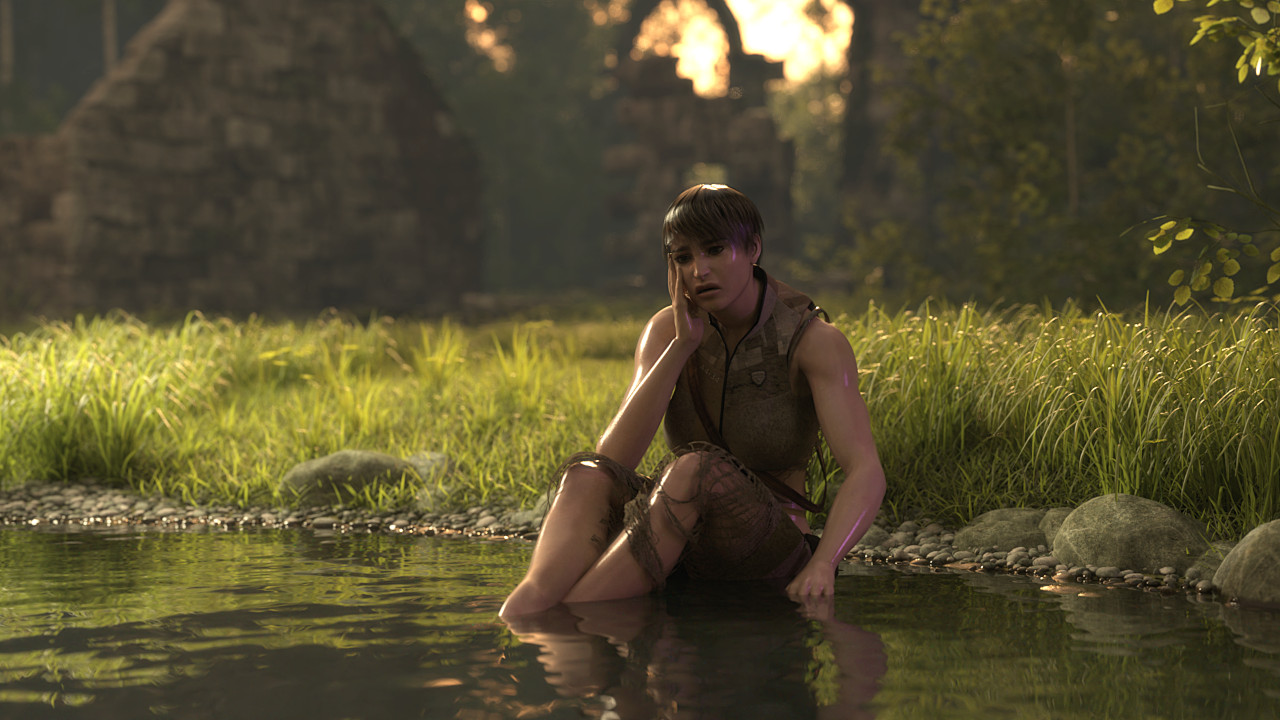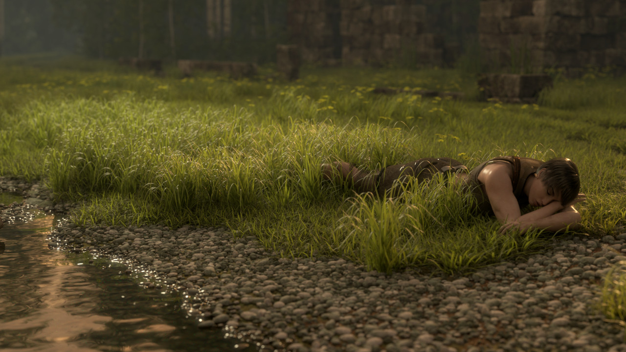 The dull, audible “hiss” from a large body of moving water tells her that she has reached her intended destination; though whose intent it was, exactly, still remains uncertain. After pushing feebly through a thicket of briar and vines, Cedar finds herself standing amid a small clearing that was once home to human structures. Though old, they do not look like old-world ruins. Rather, their style seems more peculiar to structures she has seen littering the Hinterlands, built by ancient peoples who had lived sometime after the old-world humans.
