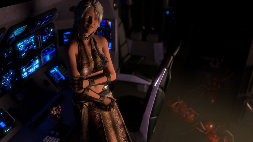 The trio moves quickly toward the vehicle, each being somewhat relieved to leave the display of carnage behind them. The machine appears undamaged, though numerous insects had been killed inside. Rihas notices a small trail of dried blood on the floor, “Somebody was injured here. But only slightly.”