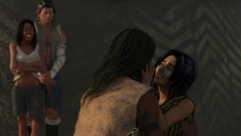 Mehetabel smiles a rare smile. The nomadic people live and feel with such expressive, colorful, and honest emotions. She will not soon forget this scene or the joyful tears she shed for Imnah. The girl is glowing with fulfillment, joy, and love for her mate. She senses Tamah beside her, similarly captured by the occasion. Tamah looks happily toward Mehatabel while sniffling and wiping tears from her cheek.