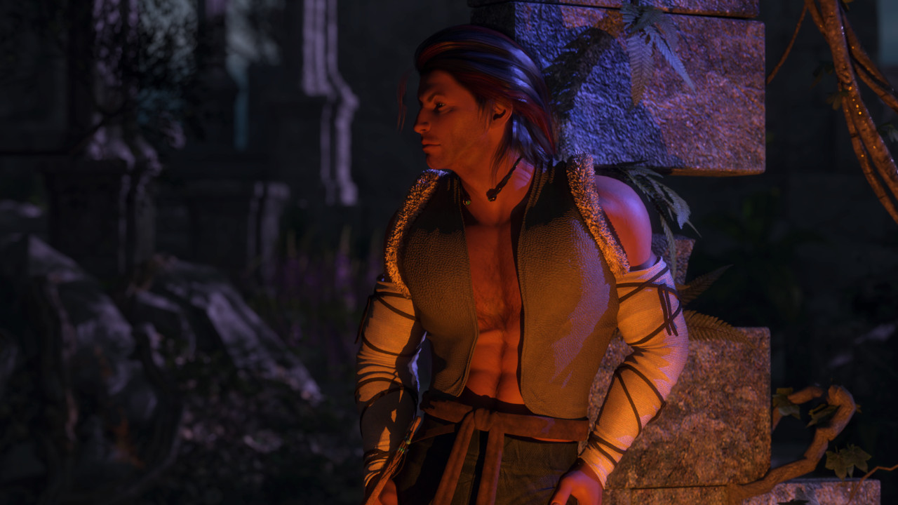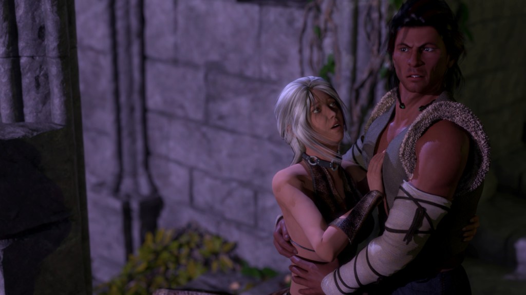 A wild scream from some sizable, terrorized beast writhing within the jaws of a much larger predator breaks the mood, instinctively drawing Mehetabel and Rihas closer together. Its piteous cries are instantly silenced amid the audible brutality of crushing bone and rending flesh echoing throughout the ruins.